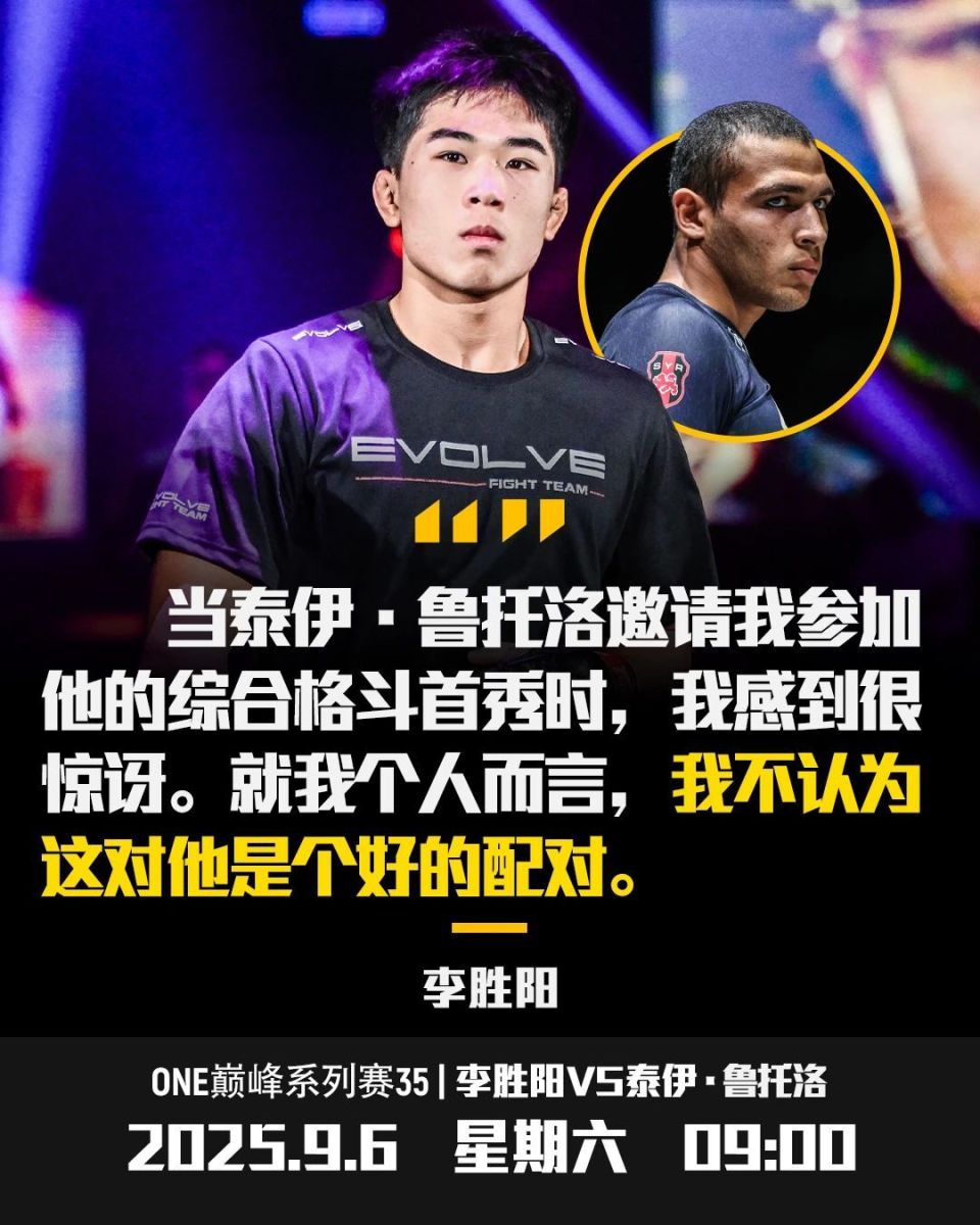 李胜阳回忆道:“当时我正在和女友旅行,突然看到一篇文章弹出,标题是‘泰伊·鲁托洛想和李胜阳交手’,我的第一反应是‘什么?我觉得这不是个好主意’。”但后来,当合同寄来时,他改变了想法:“你知道吗?我接受。这对我来说是一场伟大的比赛。但我不认为这是他最聪明的首战选择,不过既然已成定局,那就这样吧。”